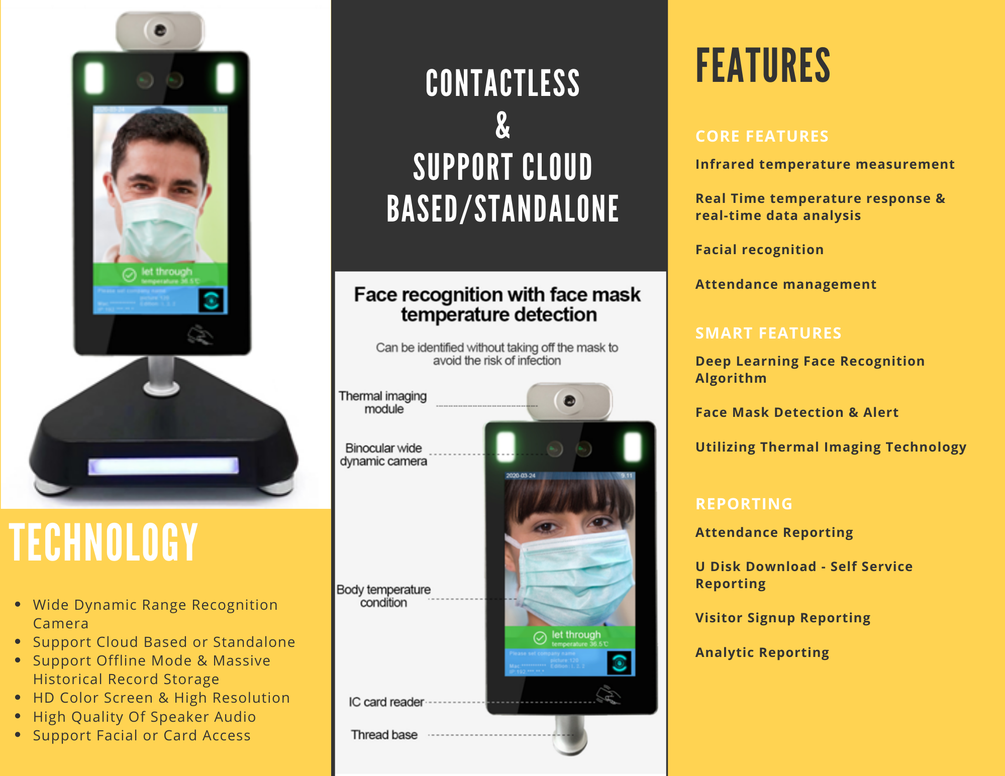 Business owner can utilize this cutting edge technology to help on measuring your visitors, customers & staffs temperature without having a personnel to take the temperature manually. In addition it records all the visitor records, it ease up for contact tracing or audit purposes.